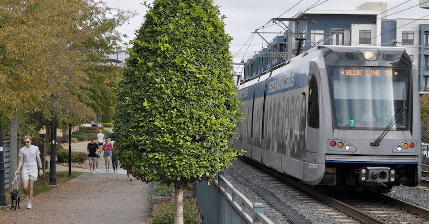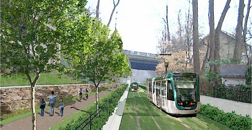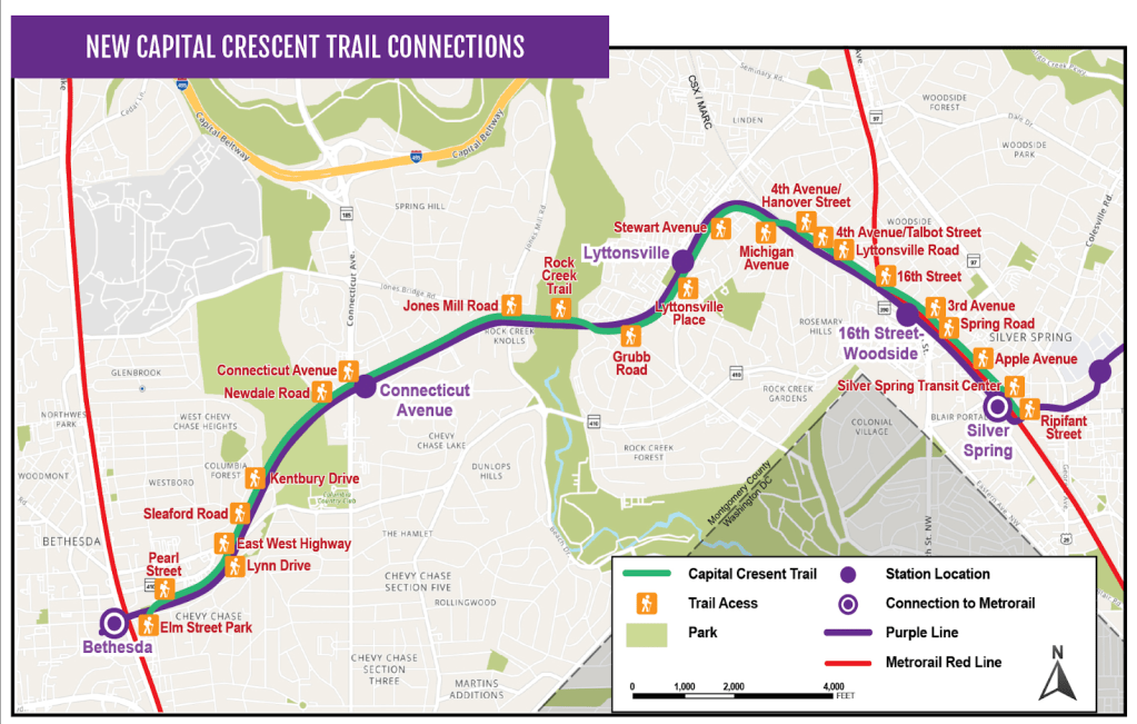 MTA is currently desiging the Purple Line in Montgomery County as a rail-with-trail alongside the Capital Crescent Trail shown in the map below and in a speculative rendition.