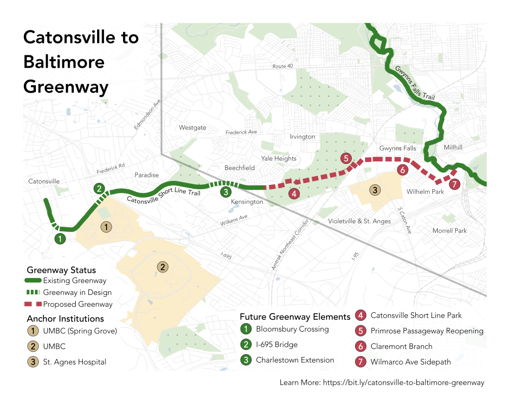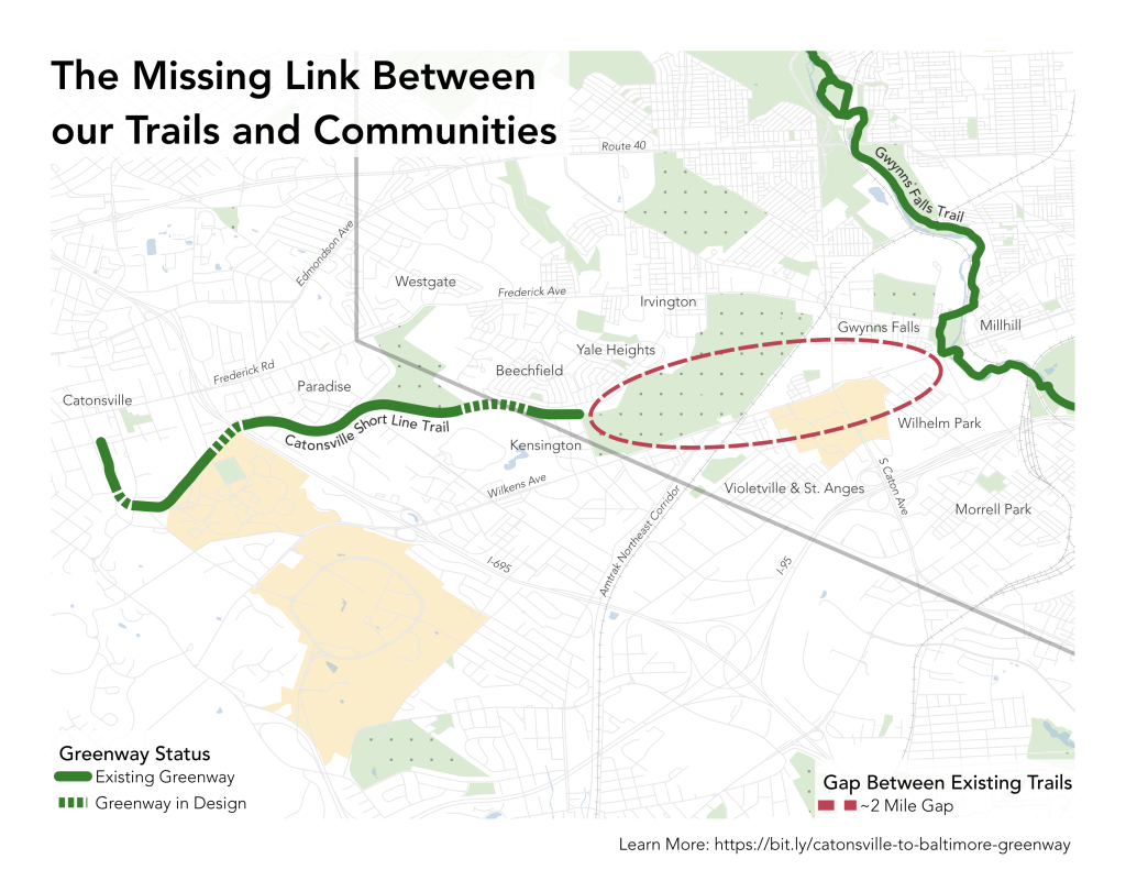 With the planned Catonsville Short Line Trail and existing Gwynns Falls Trail, all that is needed to complete this Greenway is ~2 miles of new multi-use paths to create a ~9 mile Greenway from downtown Catonsville to the Inner Harbor as shown in the map below.