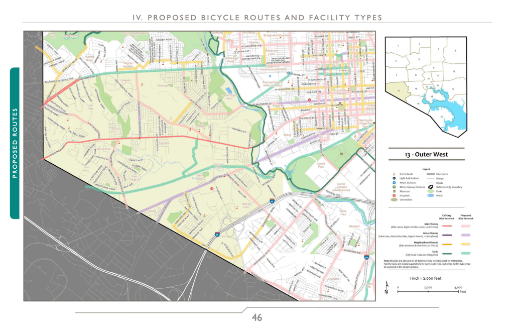 The Proposed Bicycle Routes and Facility Types map indicates plans to continue this trail through the neighborhood of Gwynns Falls along the historic rail right-of-way to eventually connect with the existing Gwynns Falls Trail.